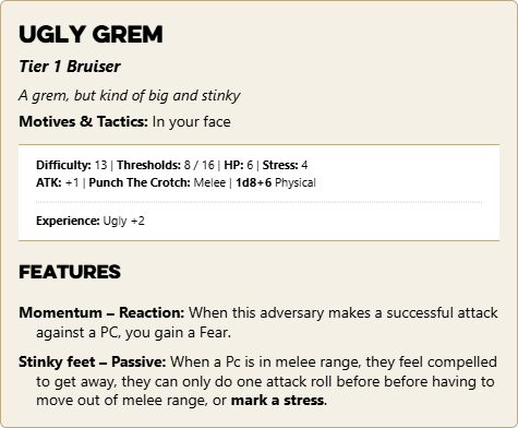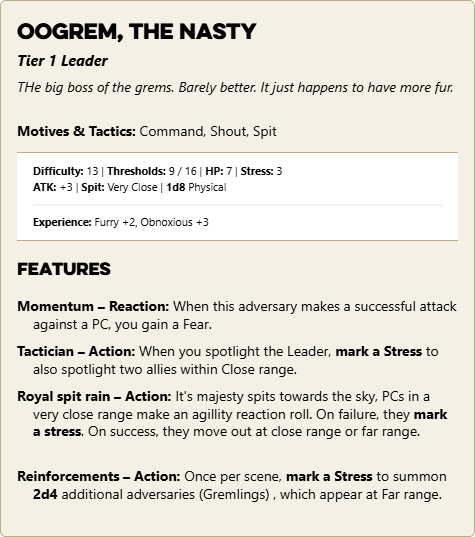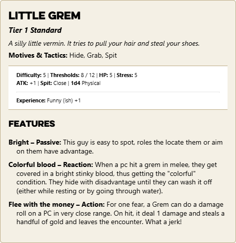 Petite famille de créatures gossantes, les Grems s’amusent à voler de petits objets, à tirer les tresses des jeunes filles et à lancer des cailloux aux passants. Ils sont très peureux et malheureusement pour eux, leur pelage les rend très visible.